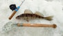 Большой выдув лески и плохой контроль с блесной вынуждают делать сильный мах, но вроде-бы всё получается и судак оказывается на льду. Не мешкаю, понимаю, что клыкастый целый день меня ждать не будет, быстро скидываю рыбу, вновь трачу драгоценные минуты, чтобы загнать "недовес" до рабочей глубины, и только мне это удается... ТЮК! Второй вышел на поверхность.
